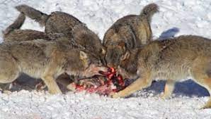 Pongámonos en situación: Una manada de lobos caza una presa animal grande, un ciervo, un jabalí o una cabra. Cazan en grupo, acorralando la presa, con rapidez y agilidad. Dada la caza a la presa, los lobos acaparan la comida y comen apresuradamente. Hay una feroz competencia entre los miembros de la manada por el animal cazado. Cuando sobran algunos restos de la presa, los lobos la entierran, con el fin de acudir a por la comida cuando los recursos escaseen.