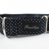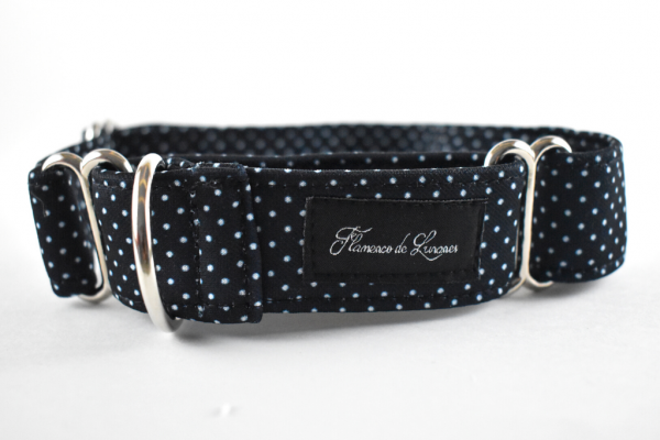 Collar tipo martingales. Cuenta con una anilla que nos permite ajustar el tamaño, independiente del propio mecanismo antitirones del collar. Cómodo también gracias la tela que cubre el nylon y que le confiere una textura y cuerpo agradable. Además es súper resistente para que lo puedas usar a diario. Con un diseño y confección de lo más original.