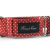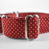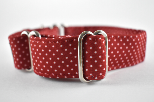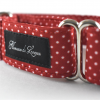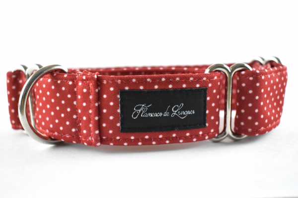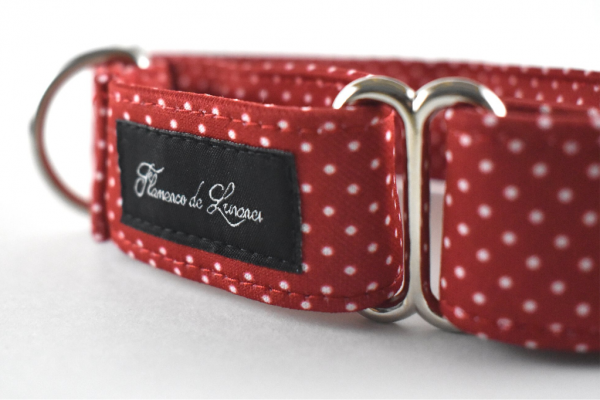 Collar tipo martingales. Cuenta con una anilla que nos permite ajustar el tamaño, independiente del propio mecanismo antitirones del collar. Cómodo también gracias la tela que cubre el nylon y que le confiere una textura y cuerpo agradable. Además es súper resistente para que lo puedas usar a diario. Con un diseño y confección de lo más original.